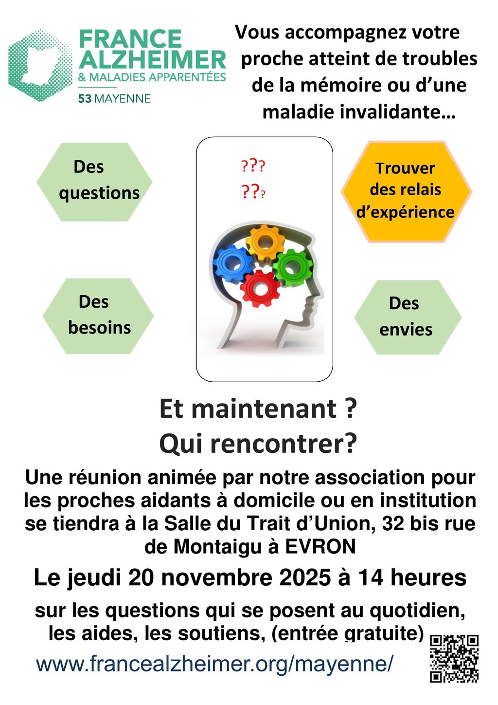 La prochaine réunion regroupant plusieurs familles d'aidants de la Communauté de Communes d'Evron ayant un proche atteint de la maladie d'Alzeimer, d'une maladie apparentée où étant aidant d'une personne en perte d'autonomie importante à domicile, aura lieu le :